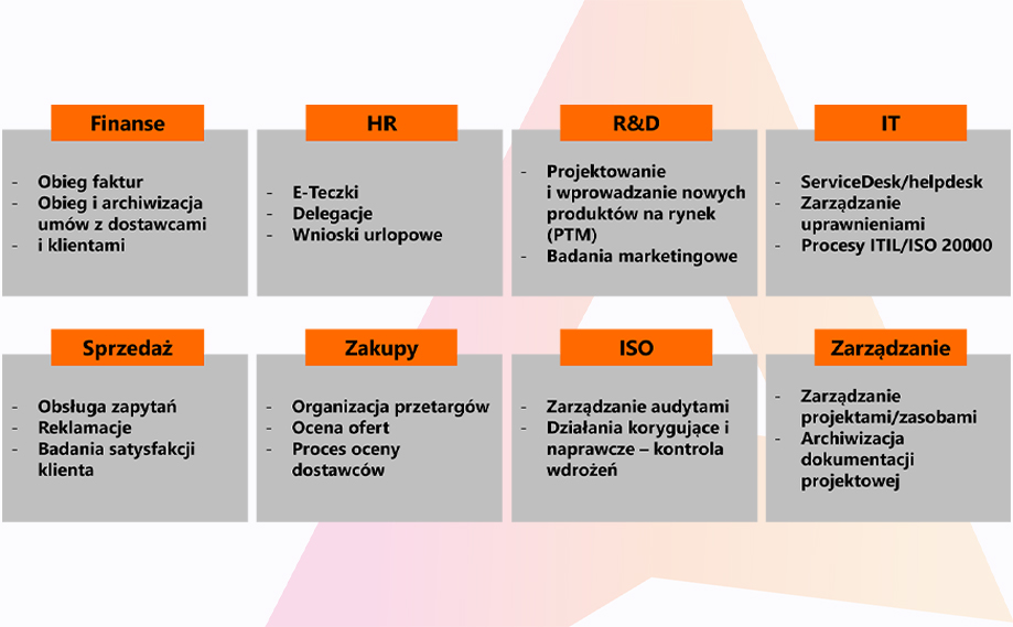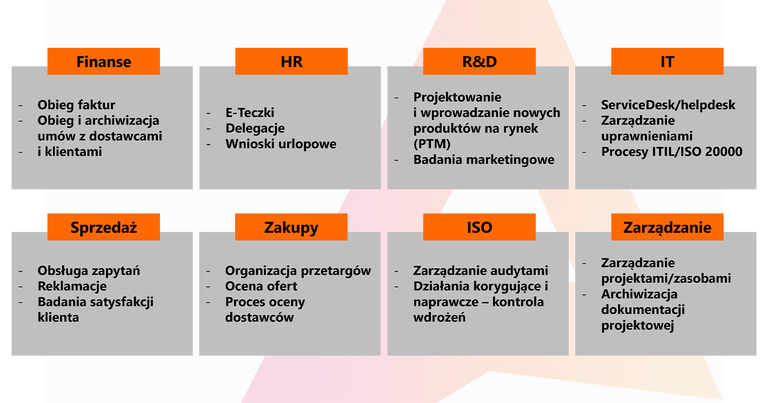 To platforma low-code, intuicyjna w użyciu dla użytkowników końcowych. Pozwala na tworzenie schematów dokumentów, modelowanie procesów w notacji BPMN, tworzenie raportów i inne zaawansowane zadania. Dzięki tym cechom i możliwość łatwej adaptacji rozwiązanie znajduje zastosowanie w wielu procesach i obszarach biznesu.