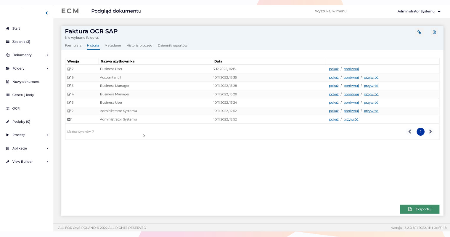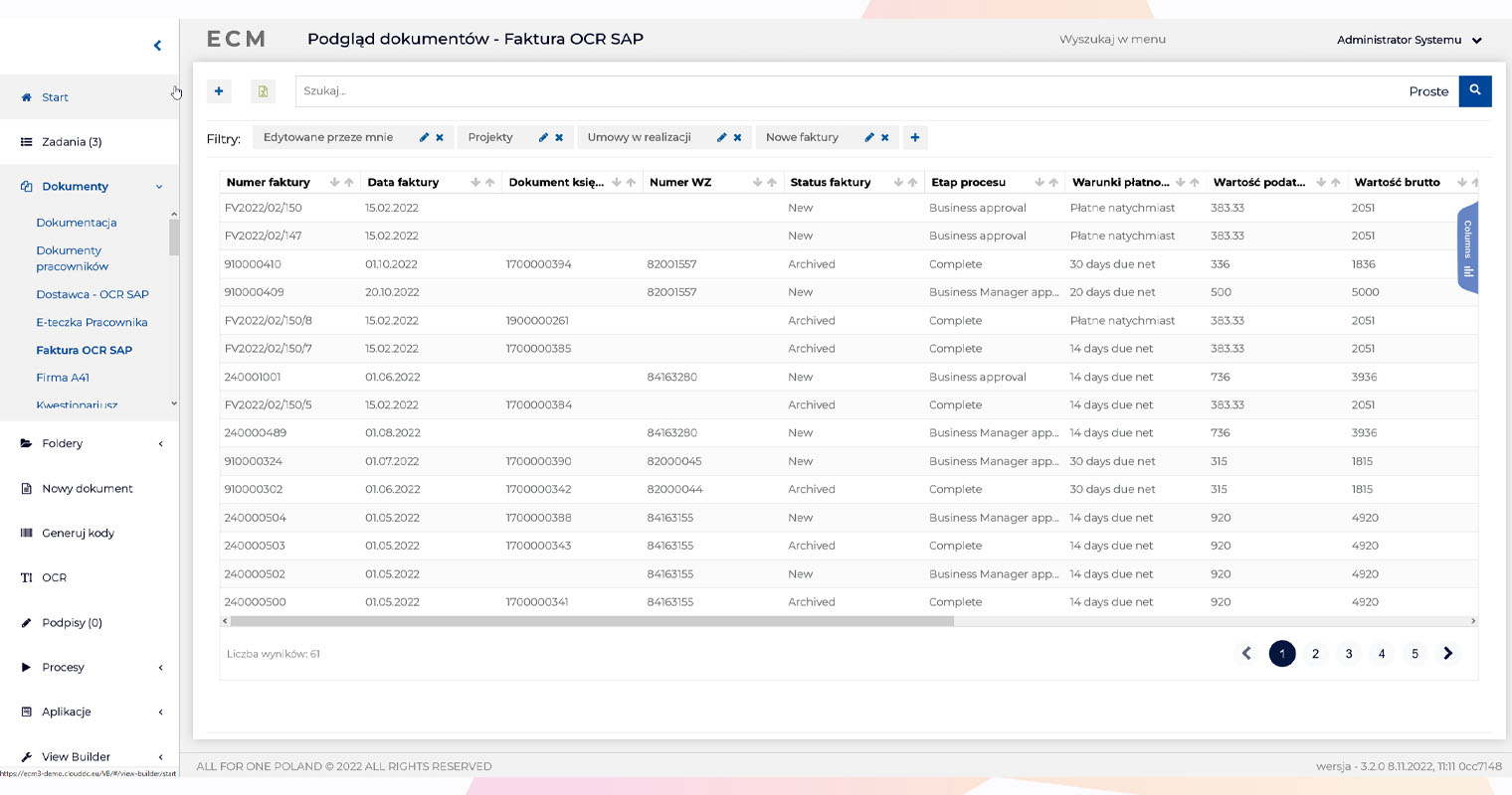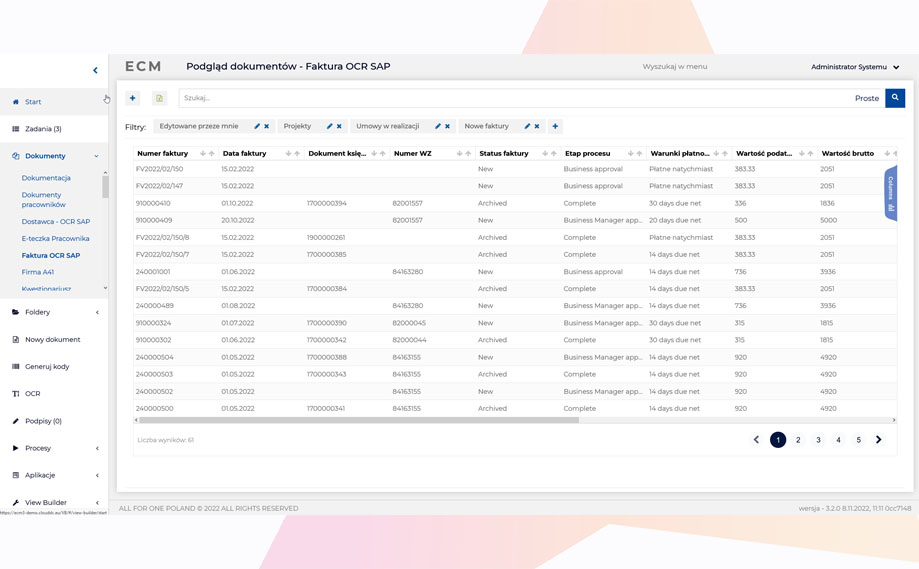 Obsługa systemu ECM jest bardzo intuicyjna. Po lewej stronie jest łatwy dostęp do aplikacji przypisanych do użytkownika (np. workflow, zadania, dokumenty, OCR, generowanie barkodu itp.). Zadania dla użytkownika są dobrze widoczne, zaległe zadania są podświetlone na czerwono.