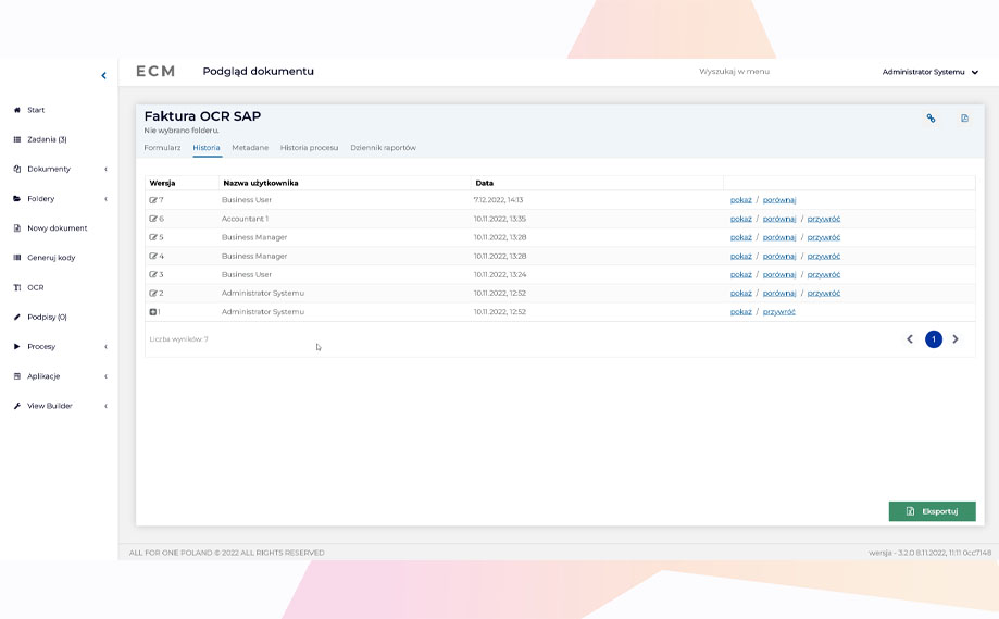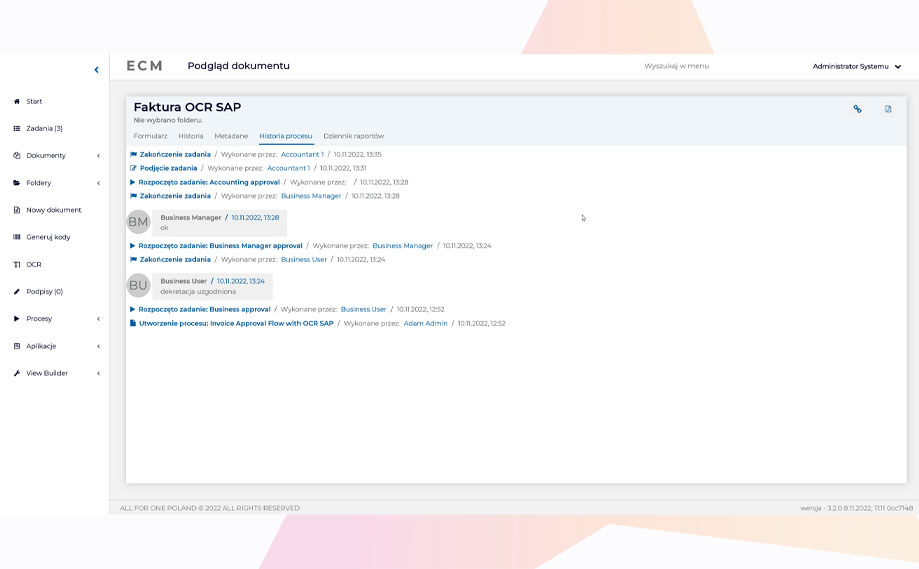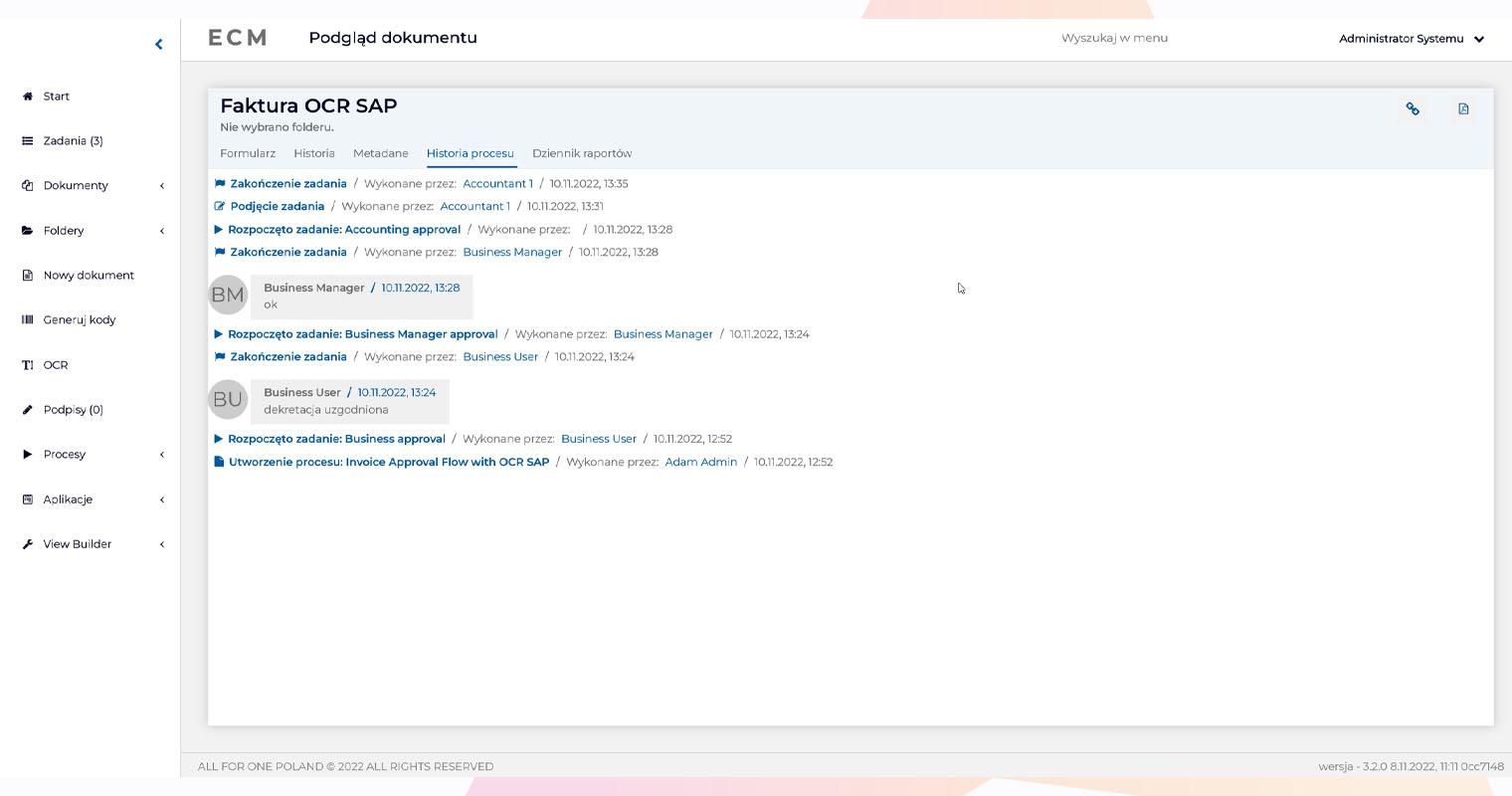 To jest ostatni element w naszym modelowym procesie, gdzie kończy się zaangażowanie narzędzia ECM. Efektem jest przeprowadzenie faktury przez wszystkie zdefiniowane kroki (ścieżka akceptacji może być znacznie dłuższa, uzależniona od warunków, np. kwoty faktury), automatyczne stworzenie dokumentu księgowego w SAP, a także pozostawienie śladu w postaci zapisanej historii przebiegu całego procesu, łącznie z informacją o zaangażowanych osobach, komentarzami i czasie, jaki zajęły poszczególne kroki.