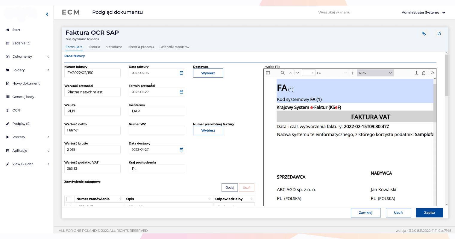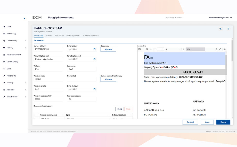 Integracja z SAP jest możliwa na różne sposoby, w zależności od potrzeb klienta (interfejs, bot). Warto podkreślić, że fizycznie faktura jest przechowywana w ECM (ECM Content Server) i z tego poziomu jest udostępniany jej podgląd w SAP (plik PDF). Dzięki temu system nie jest obciążany.